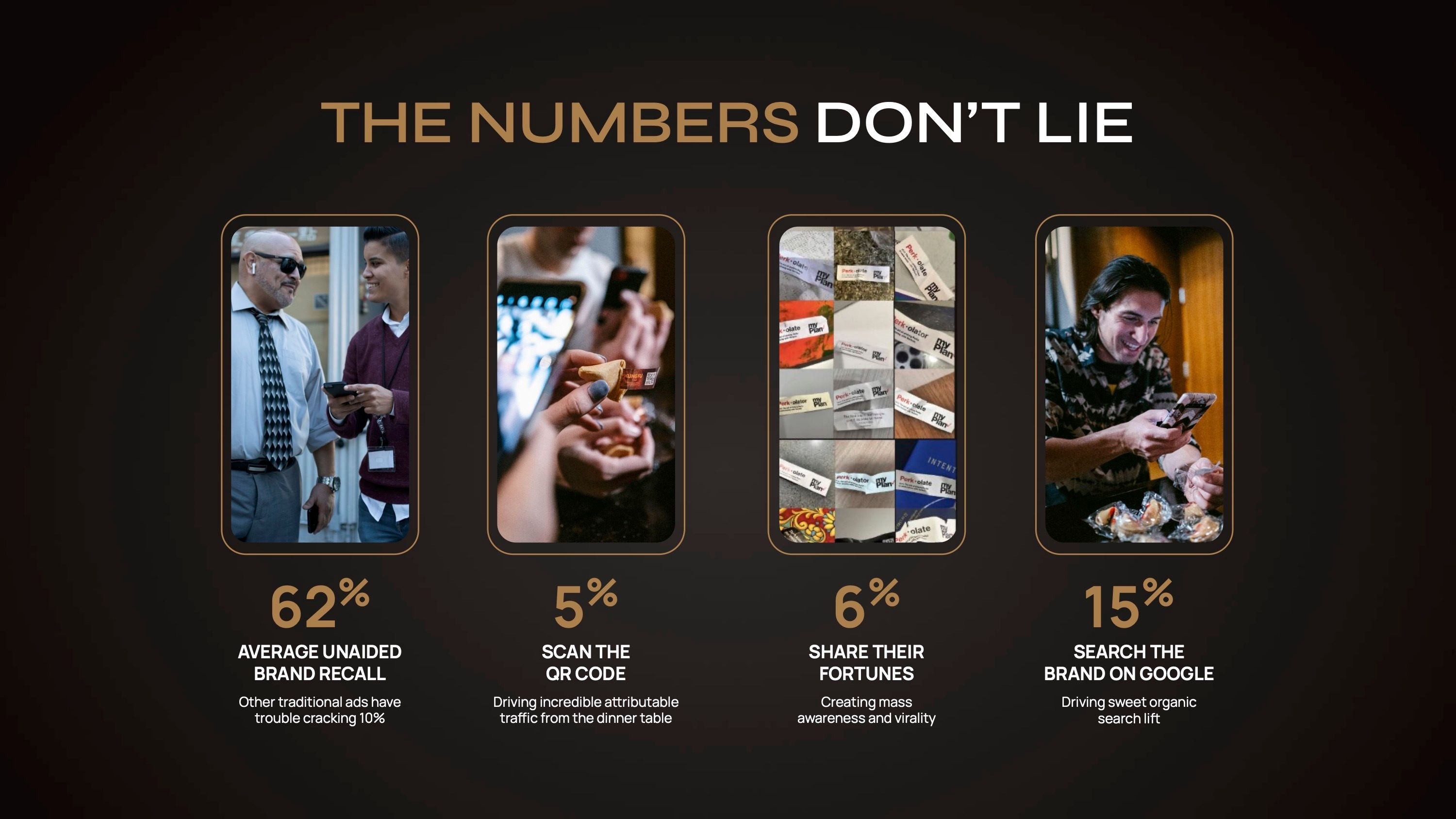 At OpenFortune, we put your brand's message inside fortune cookies served at 100,000 restaurants across the globe, and we built the entire platform around one obsession: proof that it worked.
